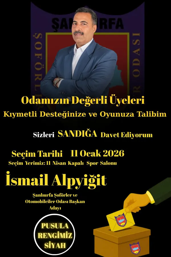 Şanlıurfa Şoförler ve Otomobilciler Odası seçimleri öncesi başkan adayı İsmail Alpyiğit, tüm oda üyelerini 11 Ocak 2026'daki seçimde görevlerini yapmaya ve sandığa gitmeye çağırdı.