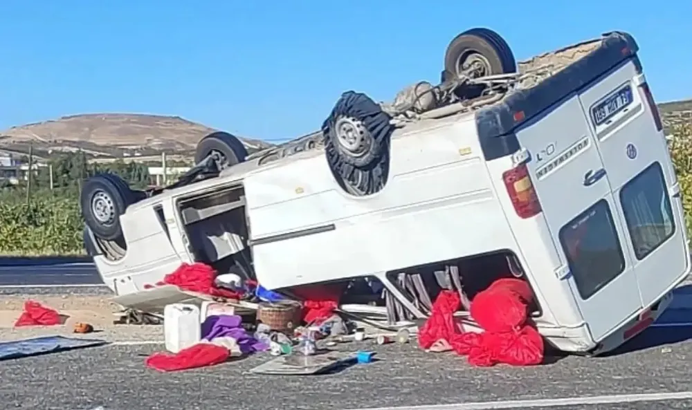 Şanlıurfa’nın Bozova ilçesinde tarım işçilerini taşıyan minibüsün lastiği patladı. Kontrolden çıkan araç takla atarak yol kenarına devrildi.
